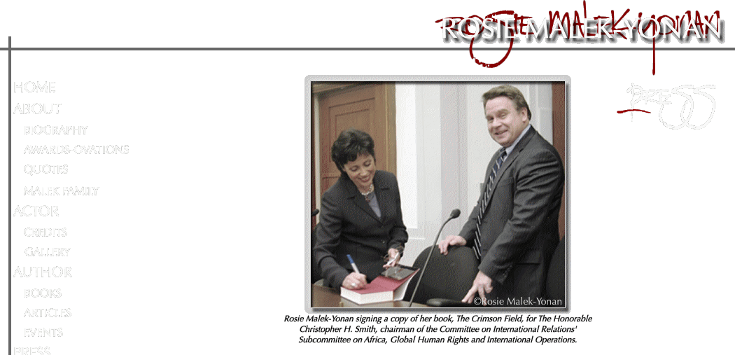 One Woman. One Testimony. One Voice. One hundred fifty souls perished that black day. One hundred fifty souls that were accounted for. One hundred fifty souls that were loved by fathers and mothers. By sons and daughters. By sisters and brothers. By wives and lovers. One hundred fifty souls, each one of them with individual names, who were expected at dinner tables that evening. That night and every night, one hundred fifty chairs would remain unoccupied, each leaving an empty space in the hearts of a nation on the brink of total extinction. One hundred fifty candles flickered in the distance when angels swept the earth for their souls. -excerpt from The Crimson Field by Rosie Malek-Yonan- Assyrian women…Mothers, wives, sisters…They are beautiful beyond comparison, wise beyond limits, strong beyond comprehension and loving beyond understanding. They possess these amazing qualities that make them the foundation of our nation. Throughout the centuries Assyrian women have suffered through wars and genocides, famines and tragedies to support their men and care for their children. They may seem vulnerable and helpless at times, but when all is said and done, they are the foundation that keep the Assyrian nation alive. One of these amazing women is Rosie Malek-Yonan, the author of The Crimson Field, an actress, a pianist, a figure-skater, a director, a daughter, a sister, and a friend. She is a beautiful woman with a great smile, petite physique, strong willed with a great heart. I had the honor of being present at the Congressional Hearing on Friday, June 30 2006 in Washington D.C., a day I will never forget, when an Assyrian woman changed the destiny of her people, bringing them hope for the future and becoming their voice of truth. How different this experience was from everything that I have ever witnessed! In a world of politics, there is no room for passion and emotions, no room for love and compassion. Everything is calculated and planned. Our people, Assyrian people, are dying every day. Our children are murdered, mutilated, beheaded and tortured. Our mothers and sisters are raped and sold as prostitutes. We cry, we sigh, we feel sorry, but life goes on and we go back to bickering about name, churches and…nothing changes, everything stays the same. Our people are still dying, our children are murdered and mutilated, our mothers and sisters are raped and sold as prostitutes. When I was getting ready to go to the hearing, I was not prepared for what I was about to witness. I was not prepared for Rosie’s courage, determination and passion. And I was definitely not prepared to see a Congresswoman, Ms. Betty McCollum, cry while she was talking to Rosie after the hearing. Prior to Rosie’s speech, we listened to the testimony given by Ms. Nina Shea, Vic e Chair of the US Commission on International Religious Freedom. While describing the situation in Iraq, she referred to us as “indigenous ancient Iraqi Christians.” I kept waiting for the name “Assyrian” to be mentioned, but alas, the speech was over and we remained as “the Christians of Iraq” in the eyes of the members of Congress and the public, as we are usually portrayed in the media. “We are ASSYRIANS! We were Assyrians before we became Christians!” I thought to myself. Still, I hoped that Rosie’s speech would clarify matters. In response to a question from Mr. Christopher H. Smith, the Chairman of the Subcommittee on Africa, Global Human Rights and International Operations, Rosie noted: “We have a name. We are Assyrians. We need to be called by our name, not just a generic Christian. We have a name, and we want to be recognized as such.” This experience almost seemed surreal and now, 24 hours later, I still have to pinch myself to make sure I am not dreaming. I was so glad that I was taking pictures during Rosie’s speech, in order to hide my teary eyes from the public. It took every bit of effort to hold back my emotions. I was watching the members of the Congress put their pens aside, listening attentively to what Rosie had to say. I was watching people in the audience, journalists, representatives of different organizations turn their heads in Rosie’s direction trying to grasp every word she said. What she said was just simple truth. Yes, she was passionate and emotional, something you hardly see in the halls of Congress. But this is exactly what Assyrians in Iraq need. Those who died, those who are dying as I am typing these words and those who will die in the hands of Islamists and Kurds. Rosie voiced our pain, our suffering, and our truth, through stories of Assyrian children killed in Iraq, statistics of Assyrians fleeing our homeland, Iraq, and through an excerpt from her book. Simple yet powerful words. Chairman Smith acknowledged Rosie’s statement as containing “well-documented facts” and referred to it as a “powerful testimony.” June 30, 2006, was one of the happiest days of my life. I left room 2172 at the Raybury Building where the Congressional Hearing was held with my head held high and full of hope for my people. One woman has accomplished more with a single testimony in the US Congress than all our political and religious leaders have in the last four decades combined. Rosie, thank you for telling the world that I am more than just a “Christian in Iraq.” For telling the world that I am an Assyrian and that my people in my homeland continue to suffer under the oppression of the Islamic forces. ~ by Nina Georgizova, Zinda Magazine, Washington DC |